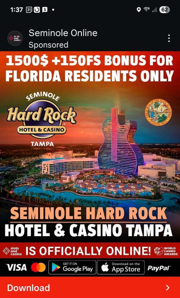 A Seminole Tribe spokesperson told InGame that the Seminoles do not comment on pending legislation. The tribe has also deflected questions about its protection of not only its monopoly, but its intellectual property in a state where social media users are bombarded with advertisements for offshore websites masquerading as legal Hard Rock online casinos. Online casino is not legal in Floirda.
