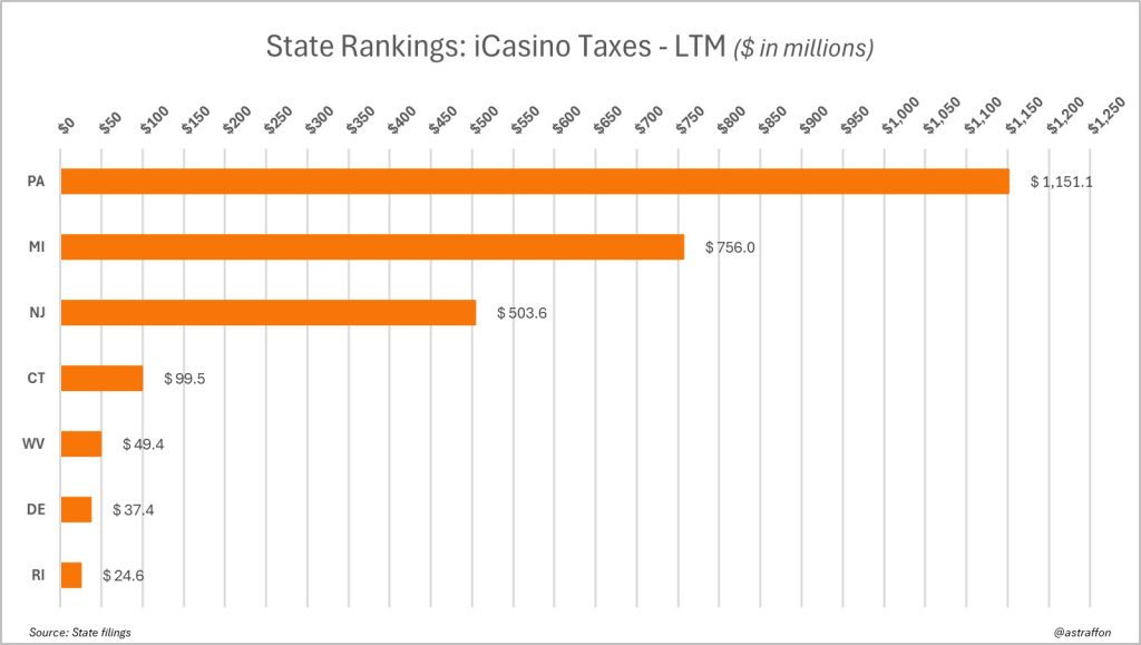 - Pennsylvania leads with $1.15 billion in tax revenue over the last 12 months from iGaming operations, driven by high tax rates on slot machine games.