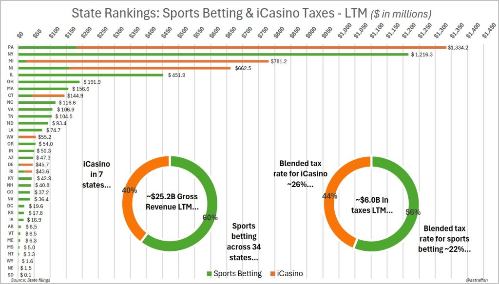 - New Jersey generated $503.6 million in tax revenue, largely due to its relatively modest 17.5% effective rate on iGaming — to 19.75% after an increase on Gov. Phil Murphy’s FY 2026 budget, which went into effect on July 1, 2025.