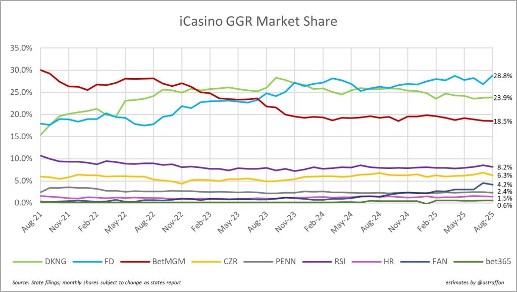 - FanDuel Casino has set a new record for its market share here with 28.8% through the latest filings, Aug. 2025.