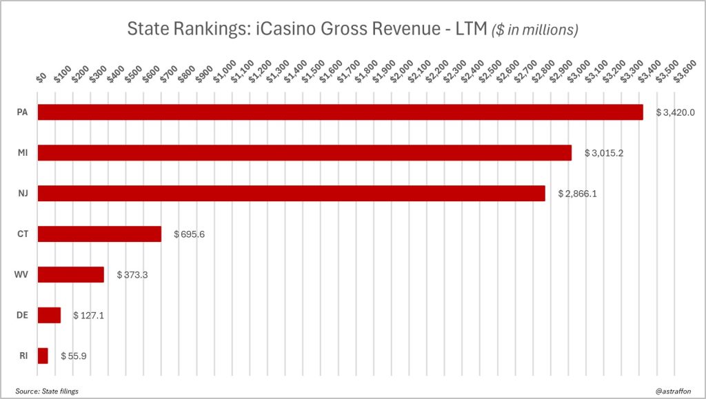 - New records are routinely getting set in multiple jurisdictions as Pennsylvania leads the U.S. iCasino market; in the PA market, operators have generated $3.42 billion in gross gaming revenue over the last 12 months;