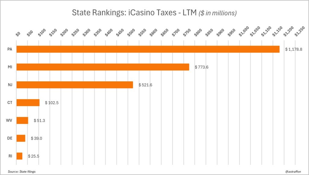- Pennsylvania leads with $1.15 billion in tax revenue over the last 12 months from iGaming operations, driven by high tax rates on slot machine games.
