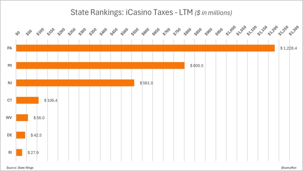 - Pennsylvania leads with $1.23 billion in tax revenue over the last 12 months from iGaming operations, driven by high tax rates on slot machine games.