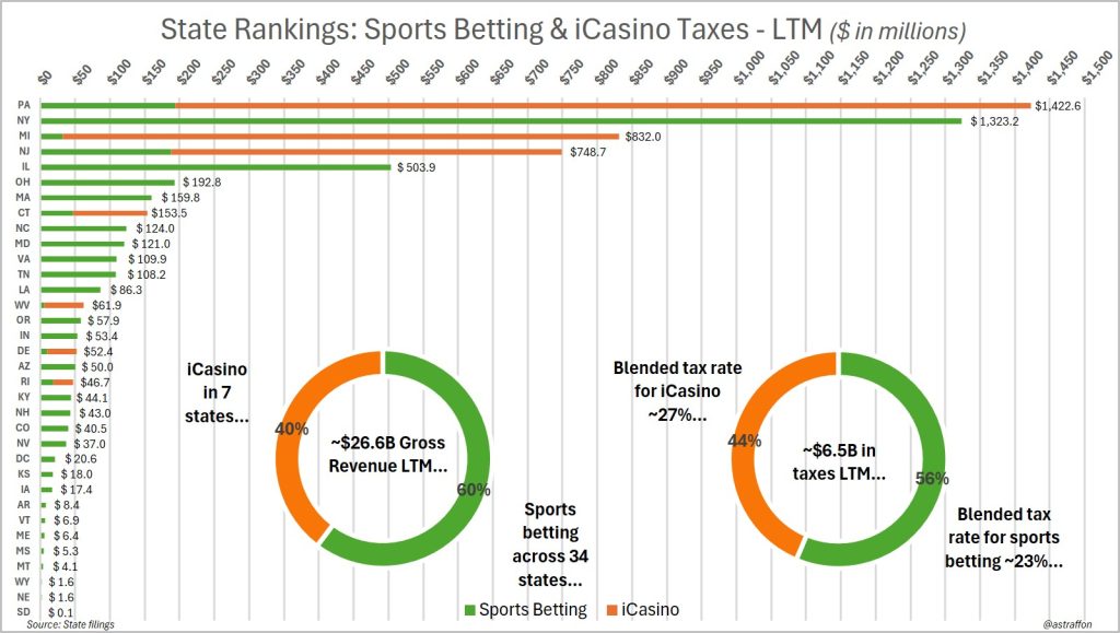 Important figures to note here: New York levies a nation-leading 51% tax on gross sports betting revenue on its nine active operators (DraftKings, FanDuel, Caesars, BetMGM, Fanatics, ESPN Bet, Resorts World Bet, Bally Bet, and BetRivers). Due to the monthly betting volume in New York that hovers between $1.5 and $2 billion, New York is nearly matching Pennsylvania’s revenue generation from iGaming and sports betting combined.