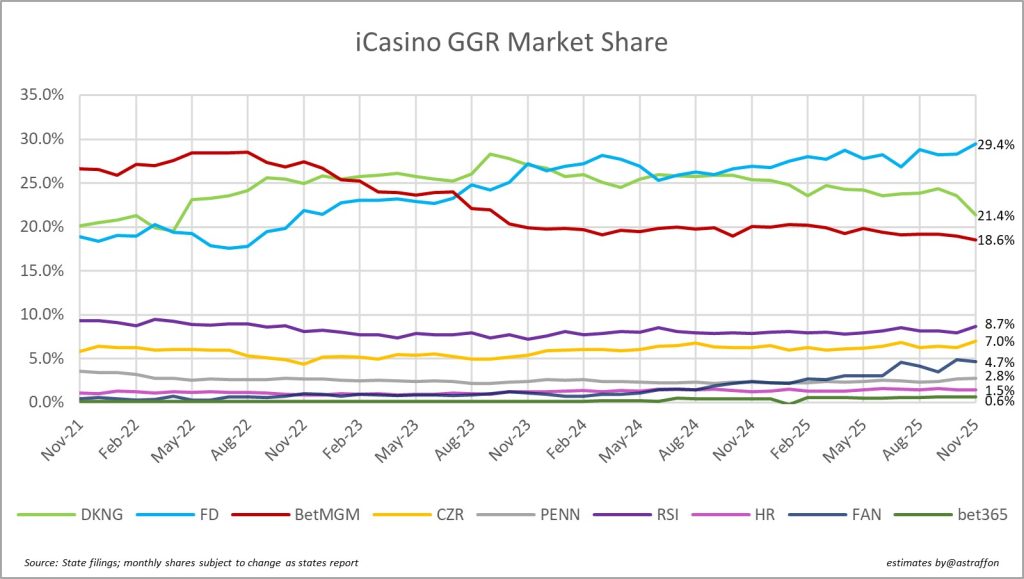 - FanDuel Casino has set a new record for its market share here with 29.4% through the latest filings, November 2025.