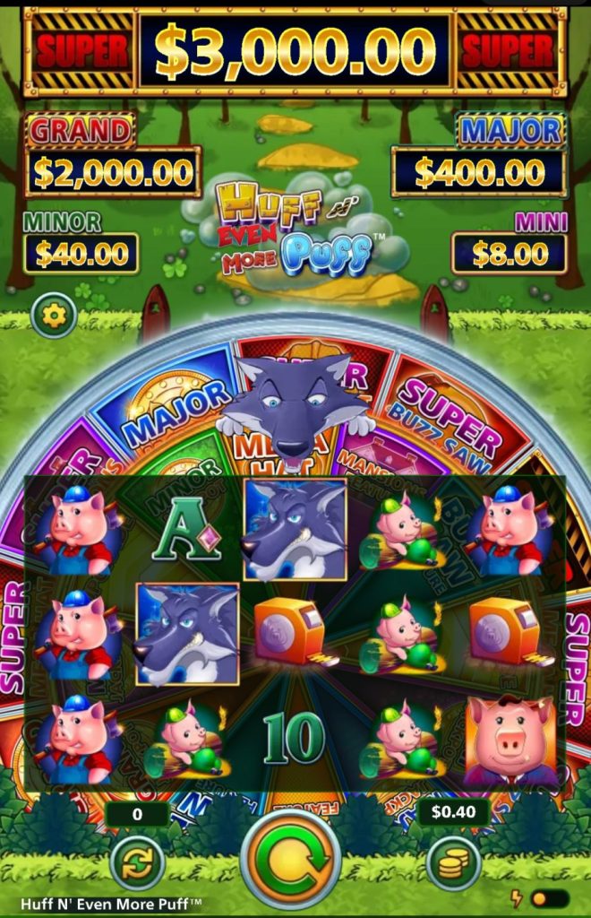 Then there’s the bonus wheel spin element of Huff N’ Lots of Puff, which is exciting in theory but often maddening in practice. As you play the game, you build up better spots on the bonus wheel, upgrading from smaller jackpots and basic games to bigger jackpots and “super” versions of the games. Randomly score that wheel spin, however, and there’s always a chance you’ll land on a non-upgraded spot, then see the entire wheel reset, and all your hard “work” is undone.