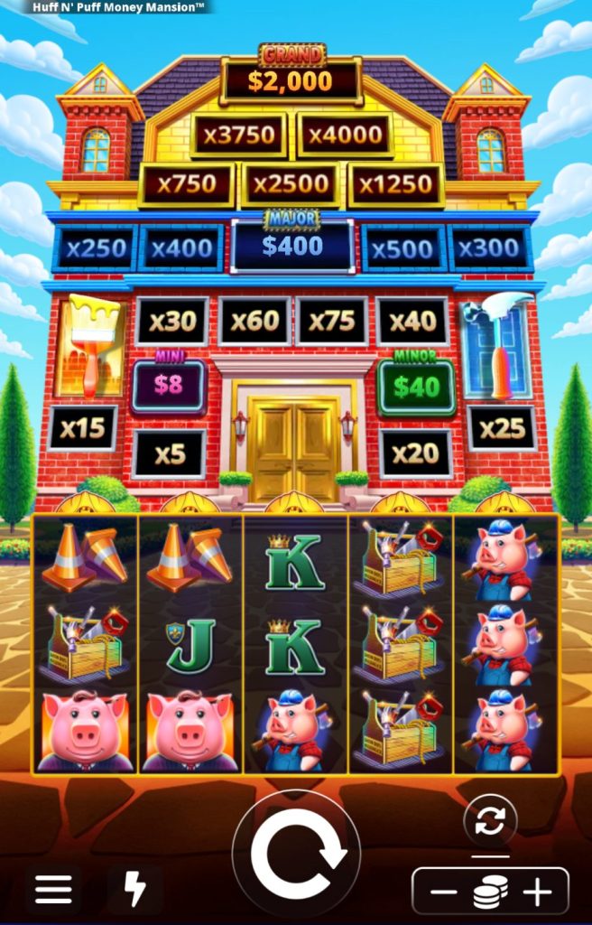 On top of that, the bonus games specific to Money Mansion aren’t particular inventive. The Touch-Up Feature is just a different way of doing the Mega Hat Feature from previous versions of Huff N’ Puff, and the Home Improvement Feature takes the same concept but expands from a 5×3 grid to 5×4. Then there’s a Mansion Feature — always the one you want in any Huff N’ Puff game, as all houses are of the brick (by far the most valuable) variety — and it’s exactly the same as the Mansion Feature in other Huff N’ Puffs.