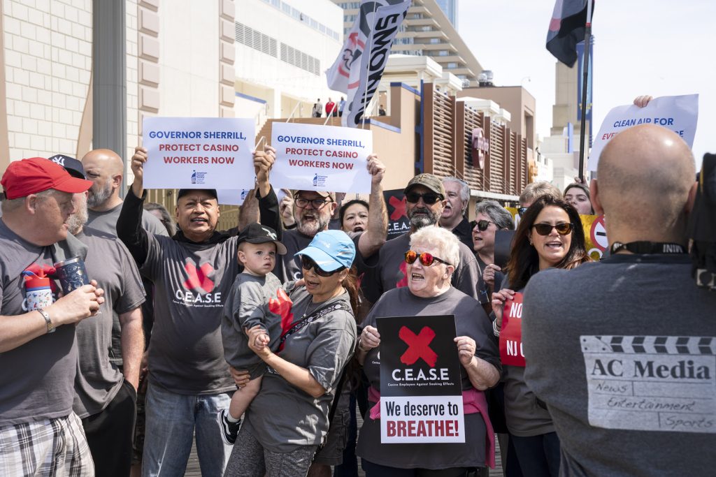 During a protest Wednesday on the Atlantic City Boardwalk ahead of New Jersey Gov. Mikie Sherrill’s address at the annual East Coast Gaming Congress, representatives of Casino Employees Against Smoking Effects (CEASE) called upon casino workers to pick a Tuesday in August and stay home from their jobs to show the industry what it would be like without them. The stated goal is for 90% of casino workers to call out sick on the same day.